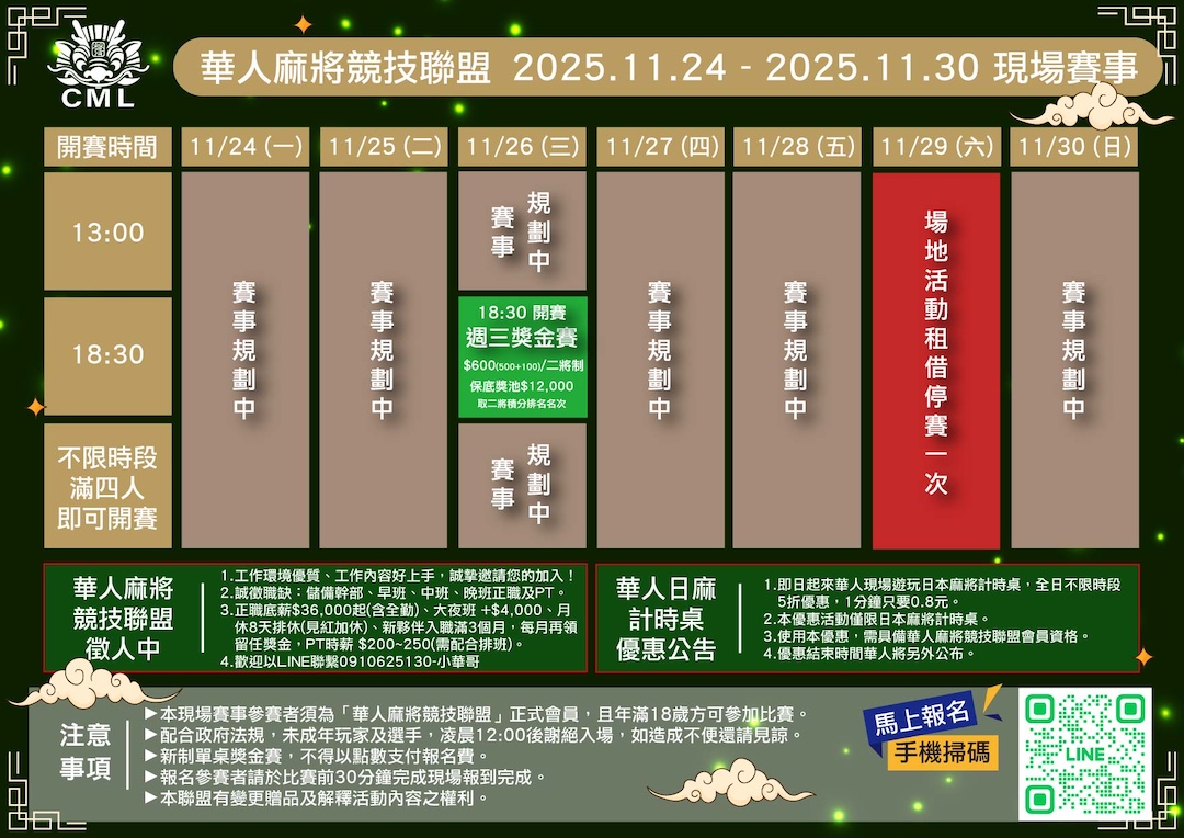 首頁最新賽事 最新賽事 NEW EVENTS 華人麻將競技聯盟致力於推廣麻將成為正式的運動競賽,天天舉辦多場精彩麻將競技比賽,包括「日常獎金賽」、「假日獎金賽」等,不僅為選手們帶來刺激和緊張的比賽體驗,同時優勝者也有機會贏得獎金! 本週賽事 近期大型賽事 華人麻將競技聯盟 台北市松山區八德路三段32號 B102-2577-7166 關於CML場地介紹場地租借方案最新賽事聯盟開幕大賽賽事報名賽事規則賽事精華 Facebook 粉絲團 華人 Instagram LINE 官方 / 報名賽事